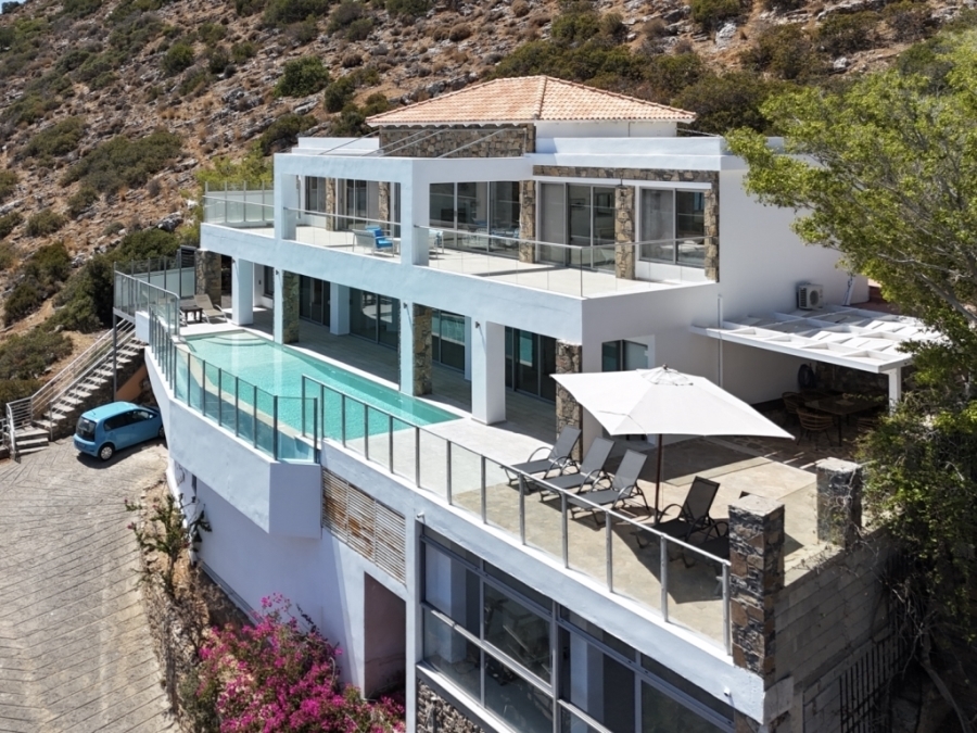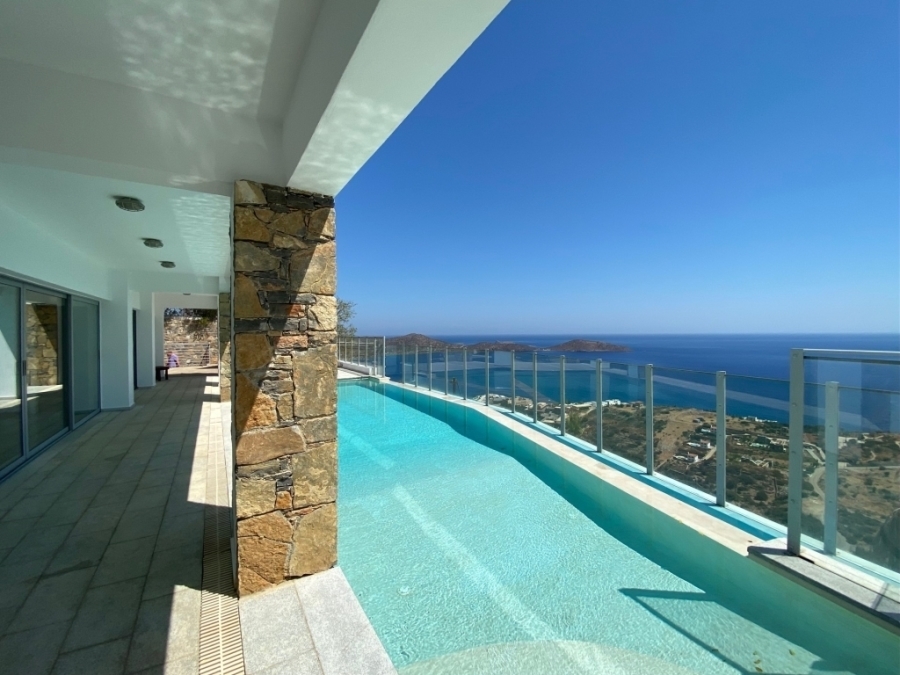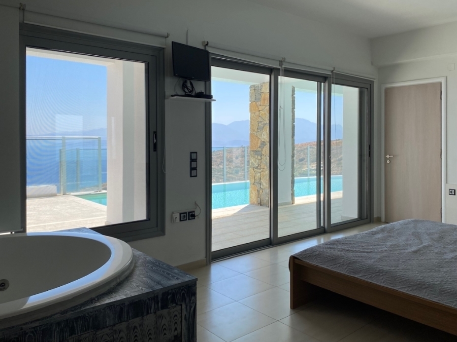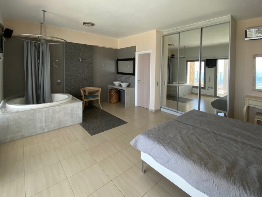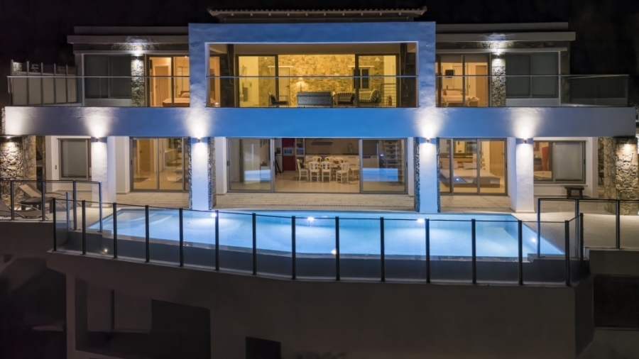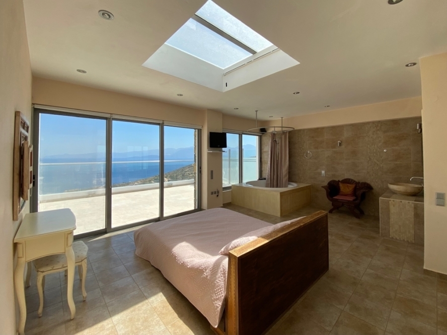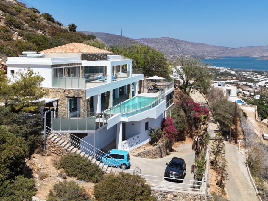 A beautiful luxurious villa in a land plot of 6.000m2 is for sale, only 2 km from the beach, 3km from cosmopolitan Elounda and 6 km from picturesque Aghios Nikolaos, the major town in Eastern Crete. This 250m2 villa is perched on hillside enjoying one of the most sought after views in Europe from every room and every terrace, that of Elounda Bay, the famous island of Spinalonga and Mirabello Bay, with the mountains in the distance. This villa which oozes quality has four bedrooms, and each double bedroom has; a Jacuzzi bath incorporated from which you can also enjoy the view, a separate WC, and a terrace. There are two on the ground and the two on the upper floor, have also, a huge skylight with remote control shutters, so that you can gaze at the stars from your bed. The ground floor has a huge fully equipped top range kitchen with an expansive dining area, which opens to a large terrace, and the beautiful 13m x 4m infinity swimming pool, with massage jets and underwater sound system. Stairs lead up from the dining area to the huge lounge and the upper bedrooms, all with large balconies to enjoy the view. Outside on the side terrace is a BBQ and on the lower ground floor a gym area.The villa is complete with TV connections in every room, satellite TV, wireless internet, a sound system to every room (including the pool), home theatre, central heating, air-conditioning, solar system and double glazing. Externally, there are landscaped gardens with flowers and palm trees and a driveway leading to parking for two cars and a turning circle. This amazing villa lacks for nothing and quality is foremost, making it a truly enviable purchase.