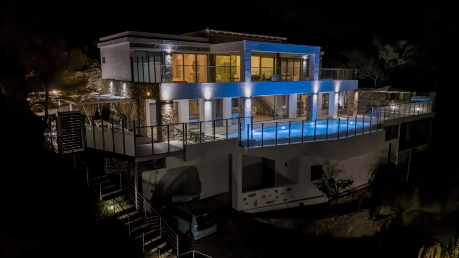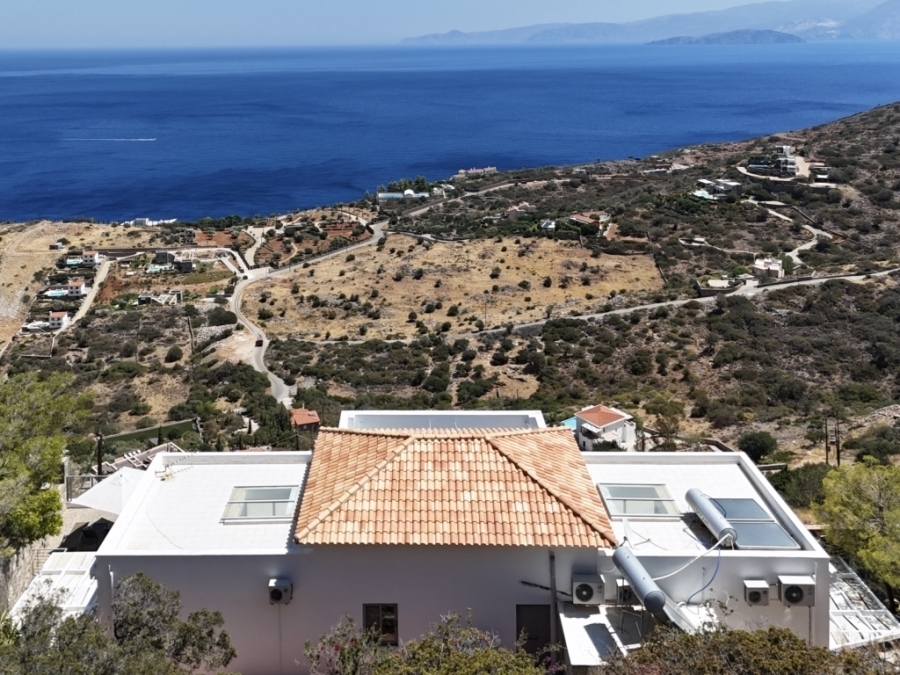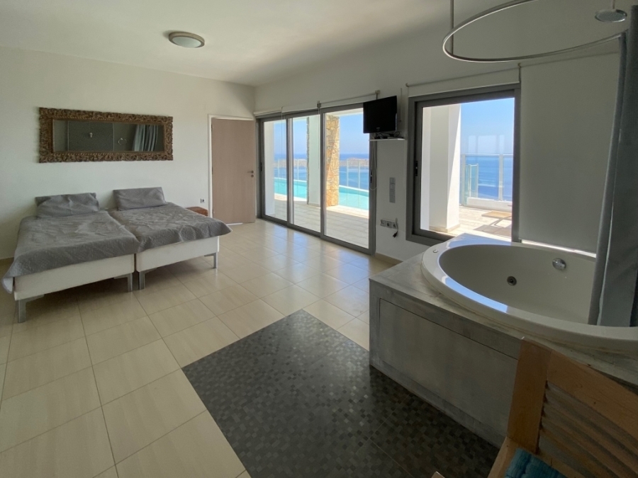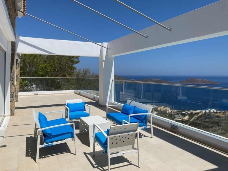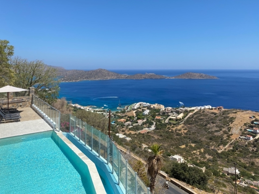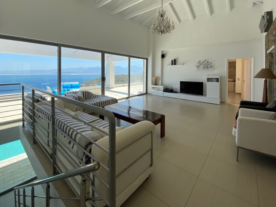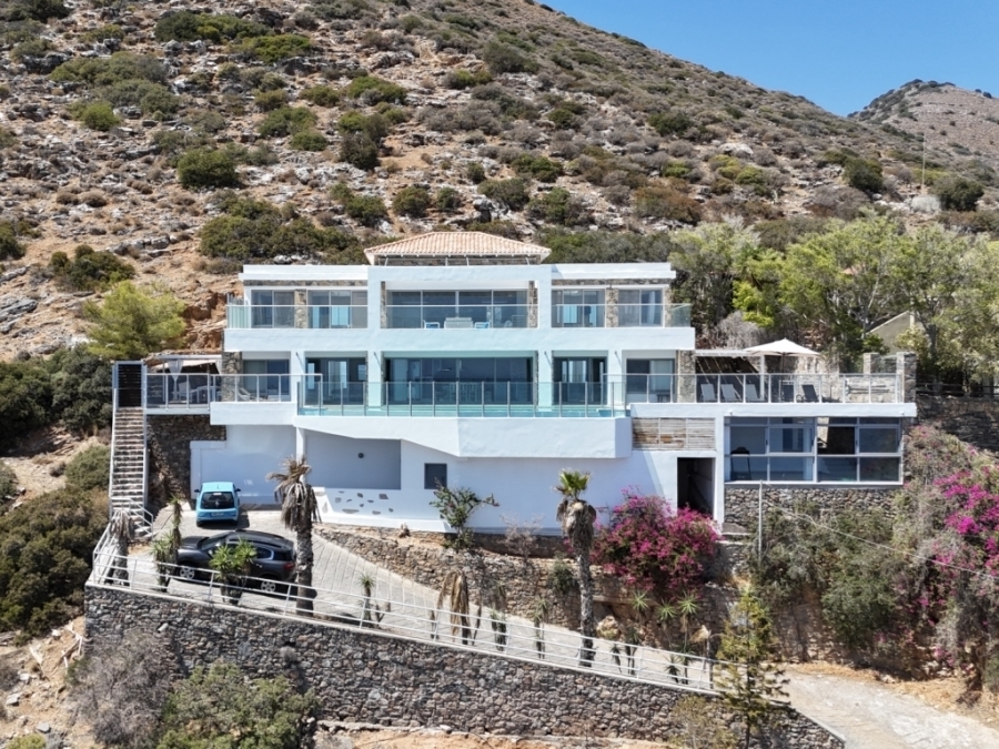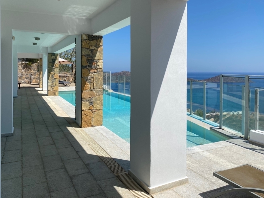 A beautiful luxurious villa in a land plot of 6.000m2 is for sale, only 2 km from the beach, 3km from cosmopolitan Elounda and 6 km from picturesque Aghios Nikolaos, the major town in Eastern Crete. This 250m2 villa is perched on hillside enjoying one of the most sought after views in Europe from every room and every terrace, that of Elounda Bay, the famous island of Spinalonga and Mirabello Bay, with the mountains in the distance. This villa which oozes quality has four bedrooms, and each double bedroom has; a Jacuzzi bath incorporated from which you can also enjoy the view, a separate WC, and a terrace. There are two on the ground and the two on the upper floor, have also, a huge skylight with remote control shutters, so that you can gaze at the stars from your bed. The ground floor has a huge fully equipped top range kitchen with an expansive dining area, which opens to a large terrace, and the beautiful 13m x 4m infinity swimming pool, with massage jets and underwater sound system. Stairs lead up from the dining area to the huge lounge and the upper bedrooms, all with large balconies to enjoy the view. Outside on the side terrace is a BBQ and on the lower ground floor a gym area.The villa is complete with TV connections in every room, satellite TV, wireless internet, a sound system to every room (including the pool), home theatre, central heating, air-conditioning, solar system and double glazing. Externally, there are landscaped gardens with flowers and palm trees and a driveway leading to parking for two cars and a turning circle. This amazing villa lacks for nothing and quality is foremost, making it a truly enviable purchase.