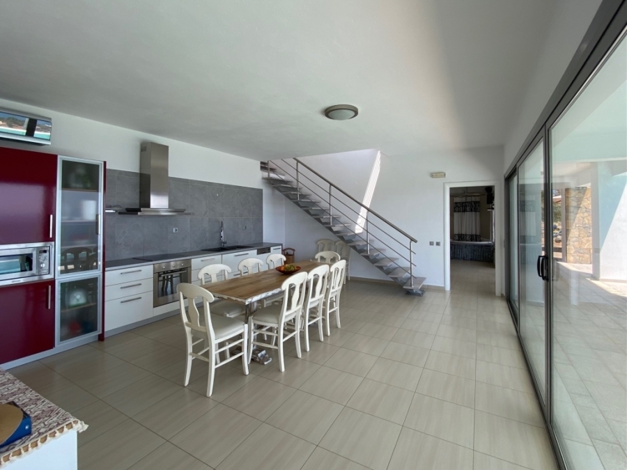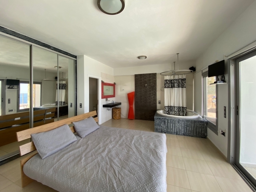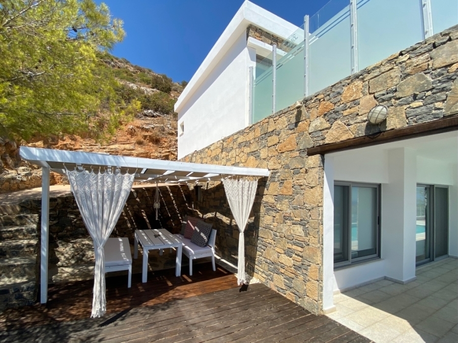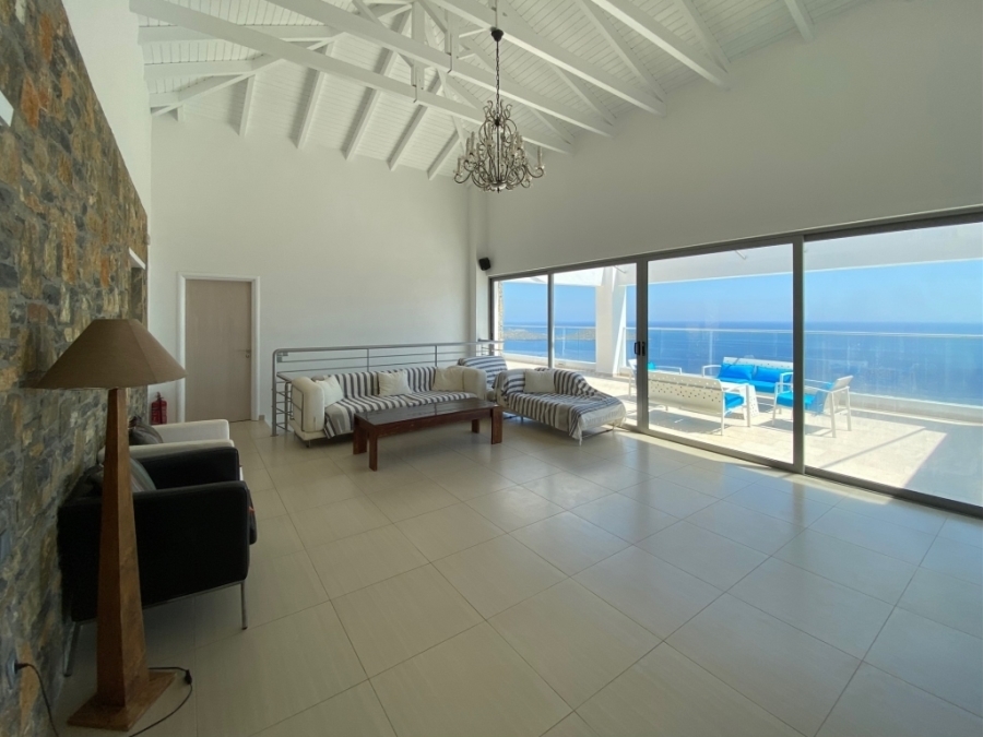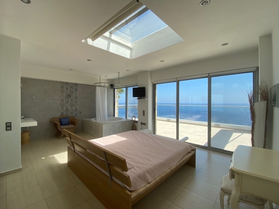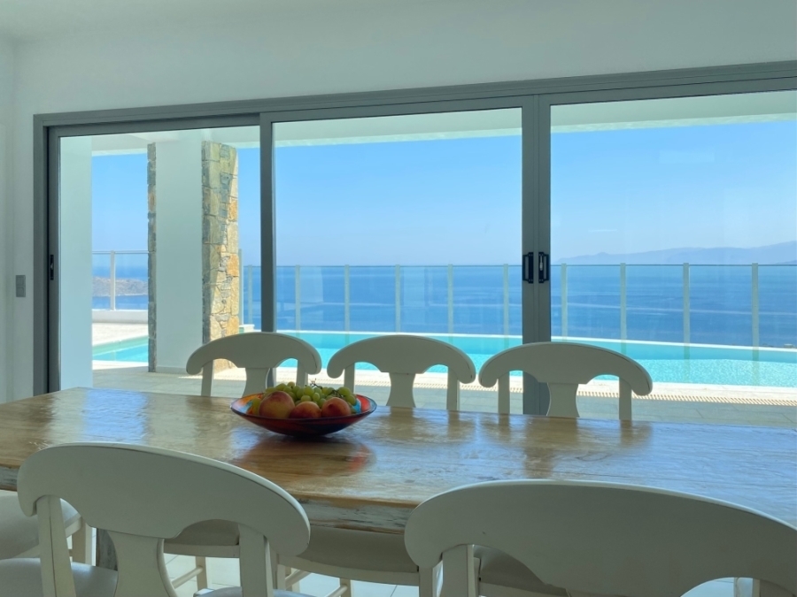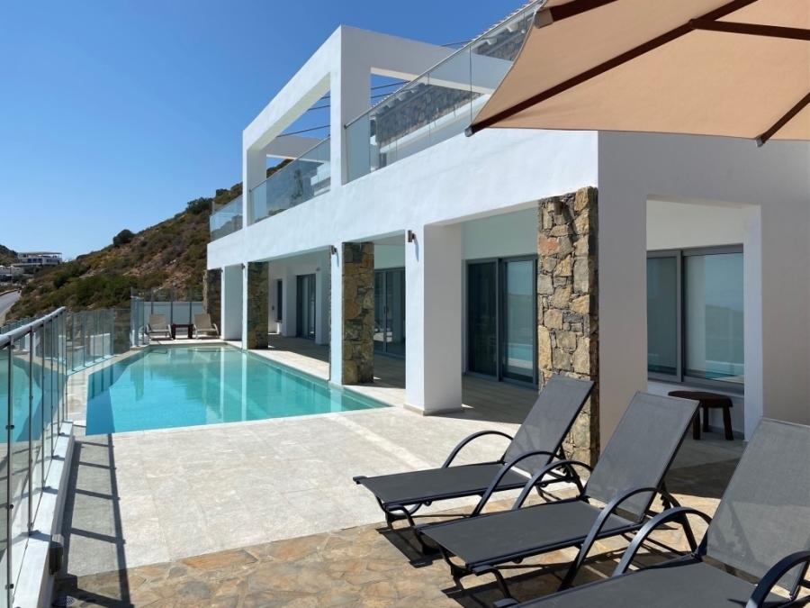 A beautiful luxurious villa in a land plot of 6.000m2 is for sale, only 2 km from the beach, 3km from cosmopolitan Elounda and 6 km from picturesque Aghios Nikolaos, the major town in Eastern Crete. This 250m2 villa is perched on hillside enjoying one of the most sought after views in Europe from every room and every terrace, that of Elounda Bay, the famous island of Spinalonga and Mirabello Bay, with the mountains in the distance. This villa which oozes quality has four bedrooms, and each double bedroom has; a Jacuzzi bath incorporated from which you can also enjoy the view, a separate WC, and a terrace. There are two on the ground and the two on the upper floor, have also, a huge skylight with remote control shutters, so that you can gaze at the stars from your bed. The ground floor has a huge fully equipped top range kitchen with an expansive dining area, which opens to a large terrace, and the beautiful 13m x 4m infinity swimming pool, with massage jets and underwater sound system. Stairs lead up from the dining area to the huge lounge and the upper bedrooms, all with large balconies to enjoy the view. Outside on the side terrace is a BBQ and on the lower ground floor a gym area.The villa is complete with TV connections in every room, satellite TV, wireless internet, a sound system to every room (including the pool), home theatre, central heating, air-conditioning, solar system and double glazing. Externally, there are landscaped gardens with flowers and palm trees and a driveway leading to parking for two cars and a turning circle. This amazing villa lacks for nothing and quality is foremost, making it a truly enviable purchase.