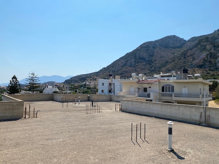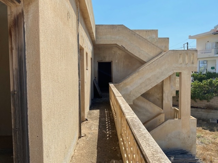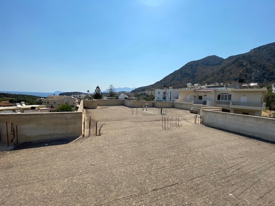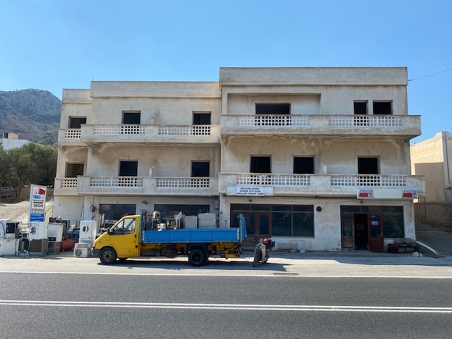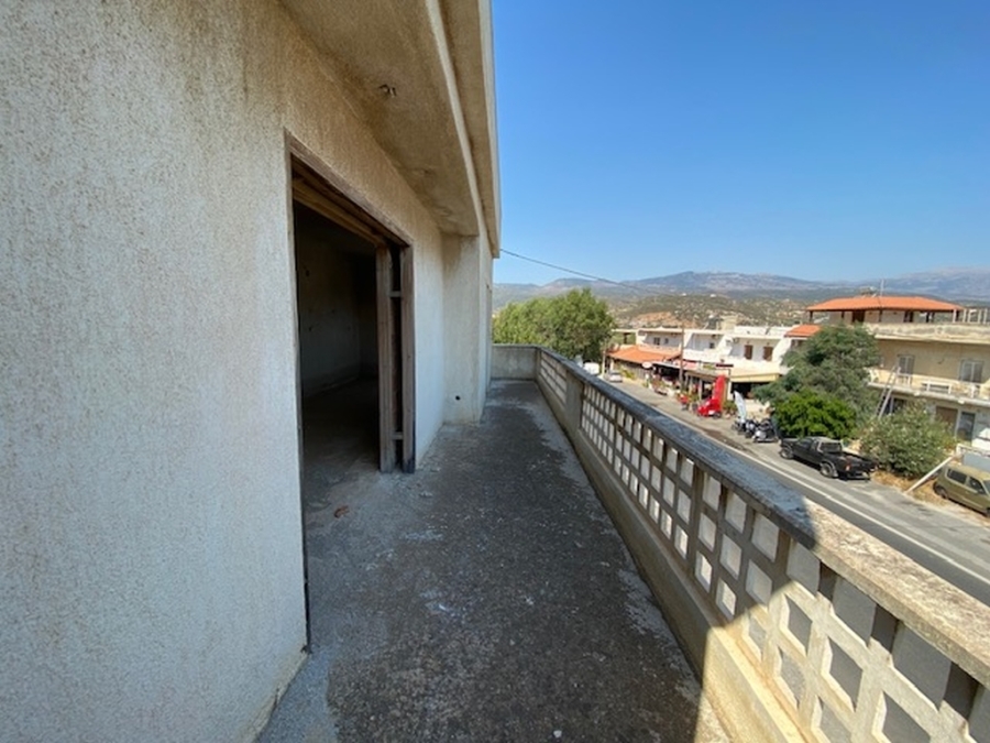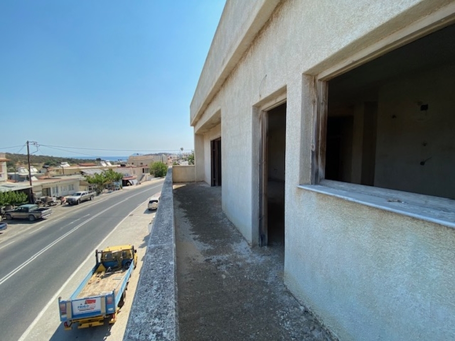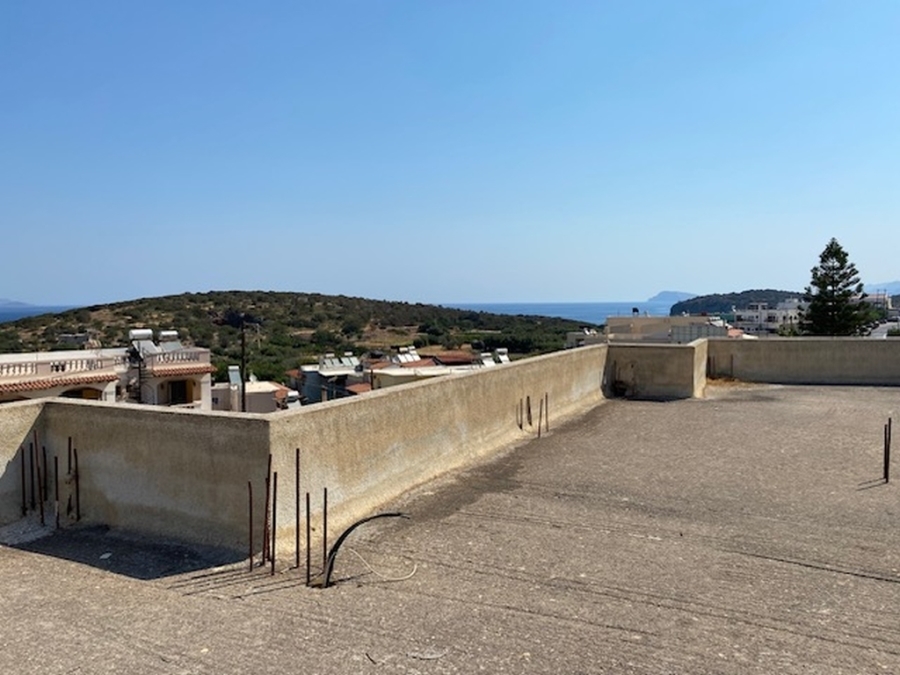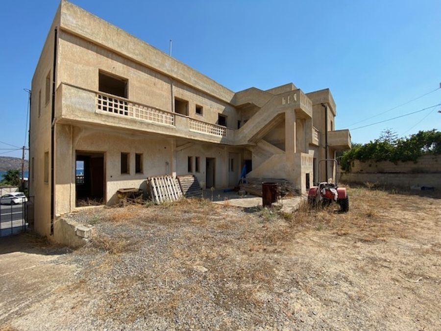 An unfinished apartment complex of 653 m2 is available for sale in the picturesque Kalo village at a distance of 300 meters from the sea and 75 km from the international airport of Heraklion. The building is located within a plot of 518m2 and is developed on three levels. The basement is 214sm2 and includes two stores of 99m2 and 115m2. The first floor has five apartments, two of which have 3 rooms and the three apartments have 2 rooms. The second floor has 4 two-room apartments. All apartments have their own bathrooms. Built in 1983, it adjoins the main road and has a view to the sea. In a developing area, this building, after renovation and completion, will be a worthwhile and profitable investment.