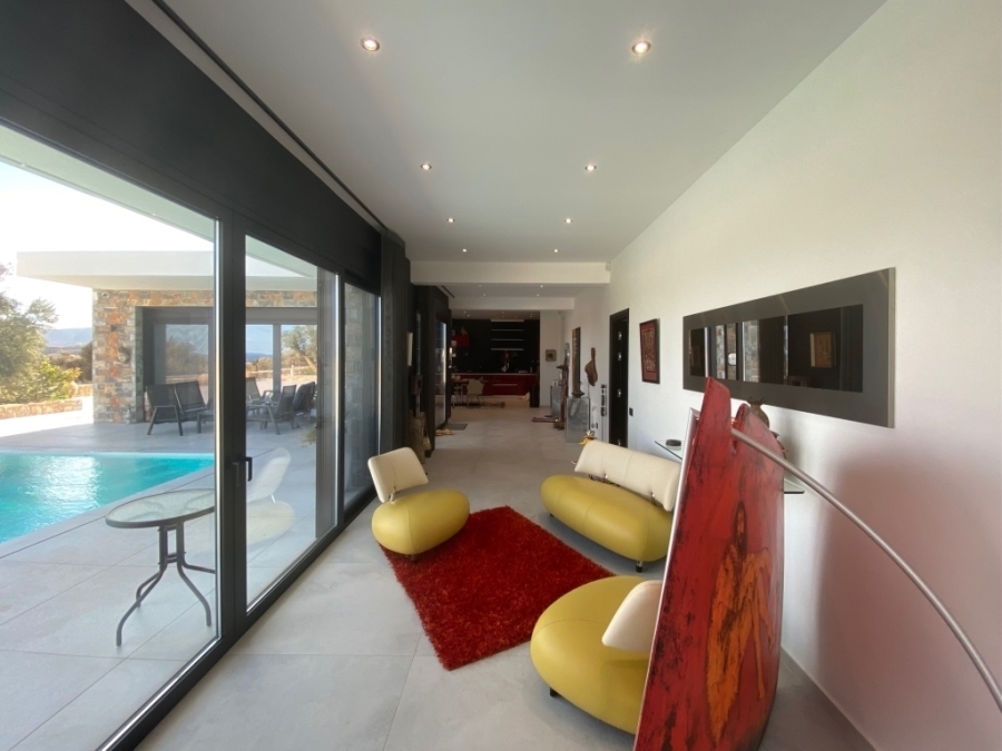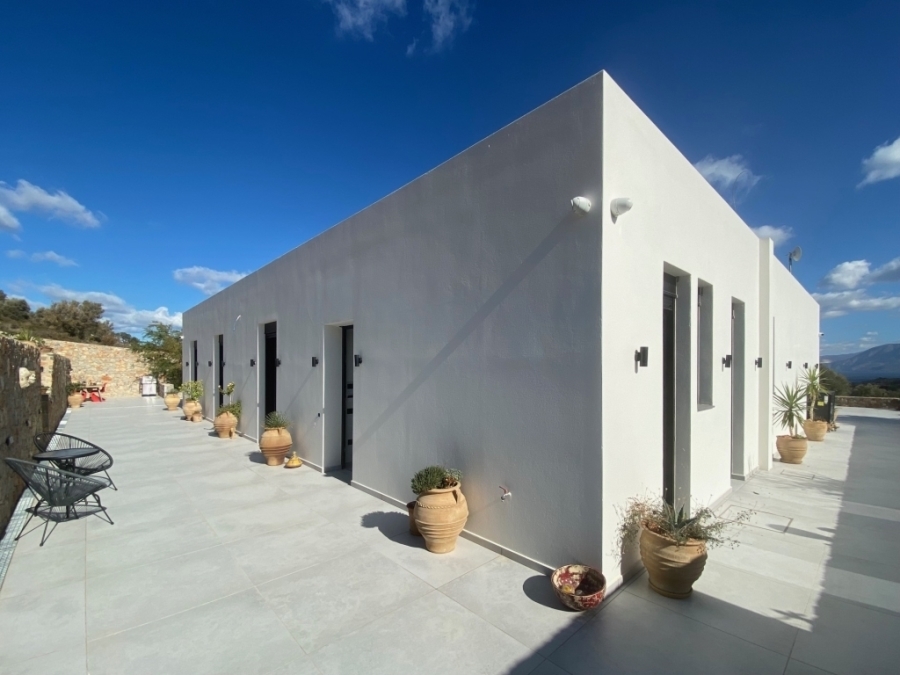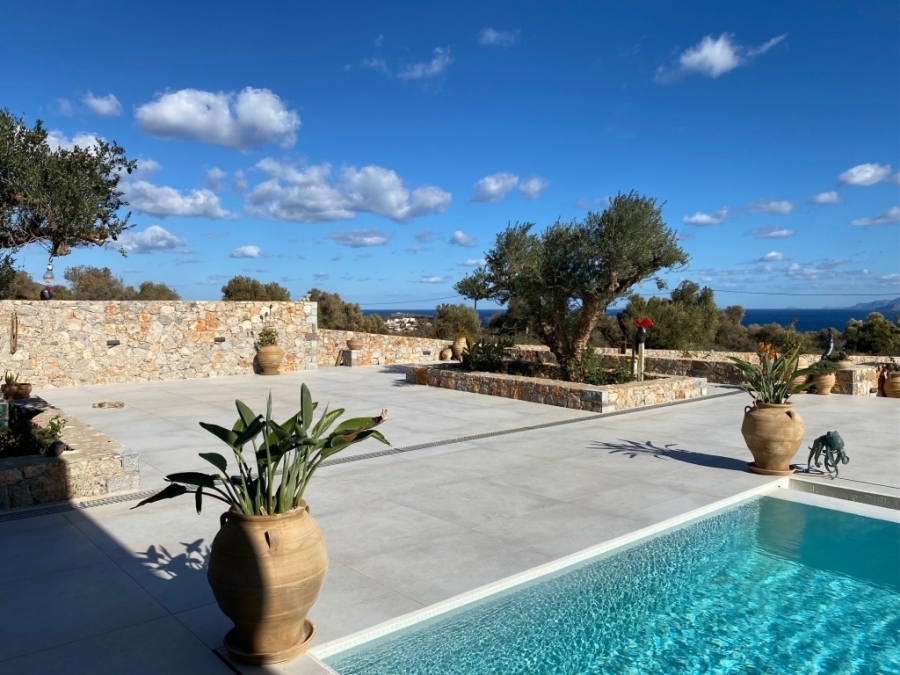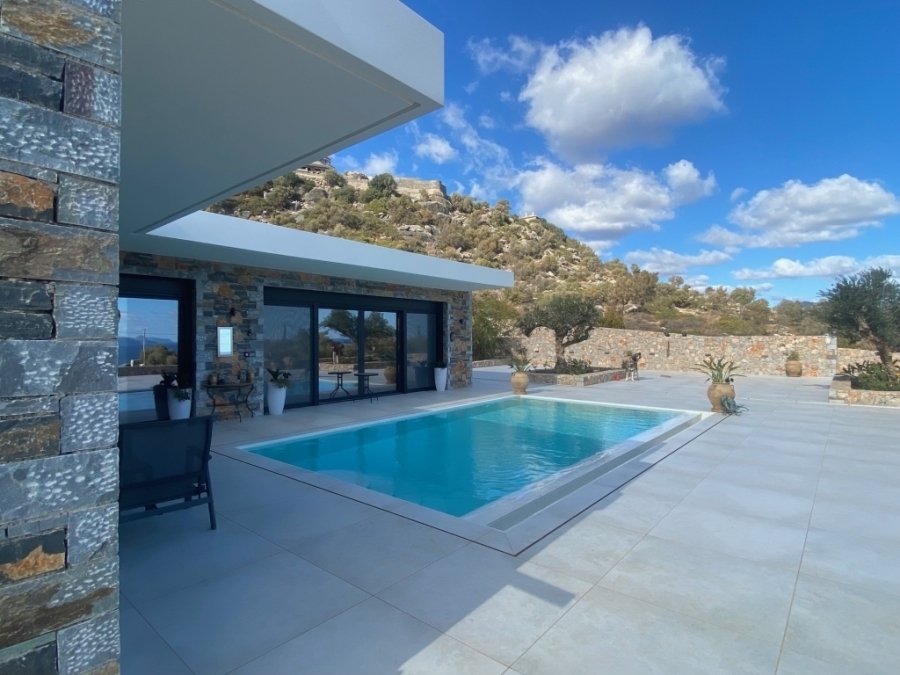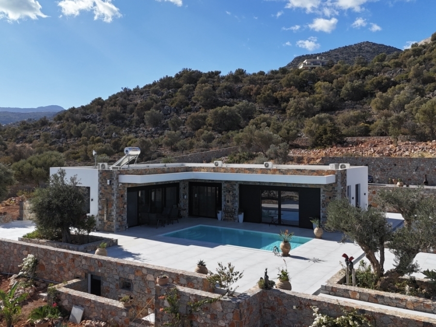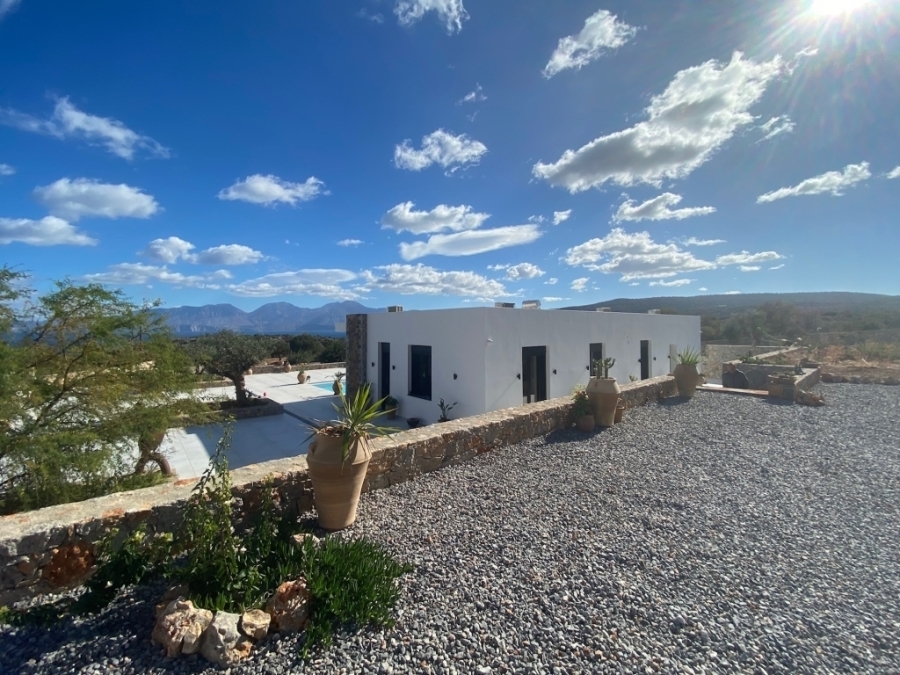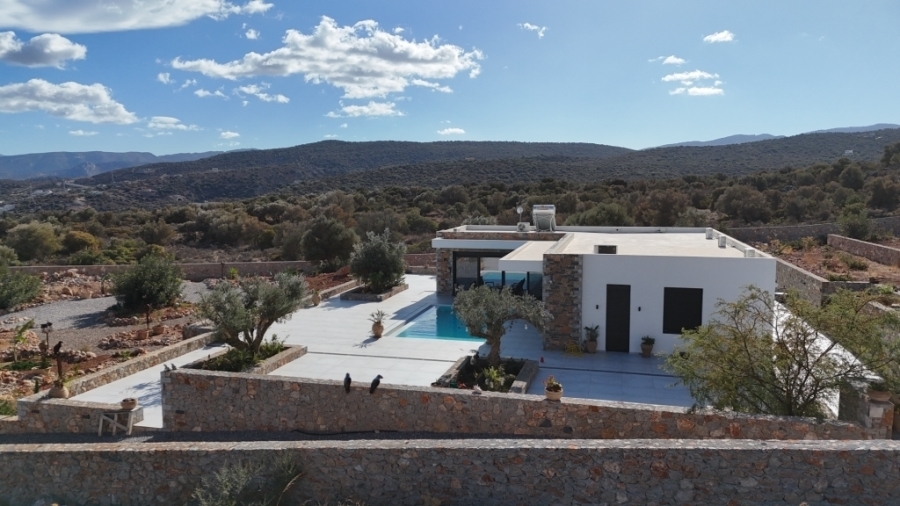 Luxury one level villa of 188m2 within a plot of 6.000 m2 located 3 km from the town of Agios Nikolaos, 2 km from the organized sandy beach and 68 km from the international airport of Heraklion. Built in 2022, it offers views of the sea and the countryside. It consists of a comfortable open area living- dining room and a fully equipped modern kitchen that opens onto a large terrace overlooking the 32m2 swimming pool. In addition, it has three comfortable bedrooms, a bathroom with shower and a storage room. Noteworthy is the additional building that provides up to 30m2. In the outdoor area there is a garden with trees, terraces and a spacious parking space. This villa, built with high quality materials, has solar, air conditioning and a security system. It is a remarkable choice for those who are looking for tranquility and privacy.