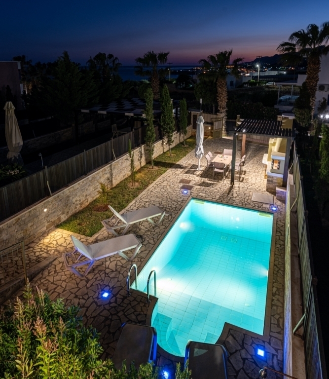 Villa of 223m2 is available for sale within a plot of 304m2 just 200 meters from the sea, 29km from the town of Ierapetra and 35km from Sitia Airport. It is constructed with materials of excellent quality and is developed on 2 floors. On the first floor there are 3 bedrooms, one of which has an internal bathroom and there is also one more bathroom. The ground floor consists of an open plan living area with fireplace, dining area and fully equipped kitchen, 1 bedroom and a WC. In the basement there is a living room, a playroom, a bathroom with a sauna and hydromassage, an internal storage, laundry room as well as the engine room. Outside there is a private heated pool with Jacuzzi, garden, barbecue, pergolas and parking. In addition, the villa features autonomous and underfloor heating, air conditioning, fireplace, doorphone, automatic garage door, security system, satellite TV, internet, safe and automatic watering. This is undoubtedly a valuable investment option.