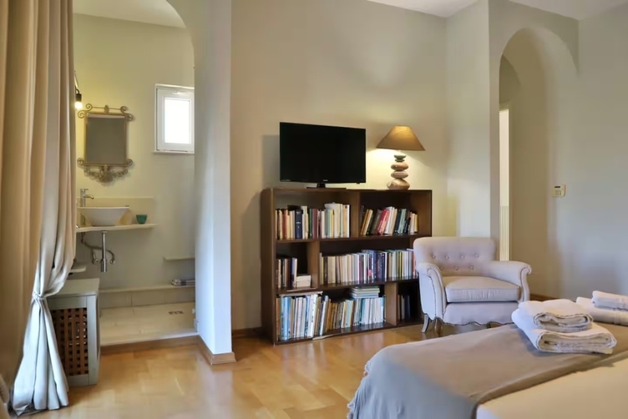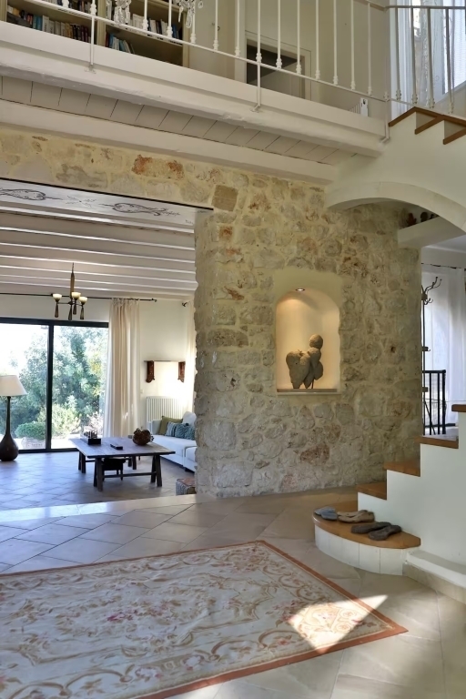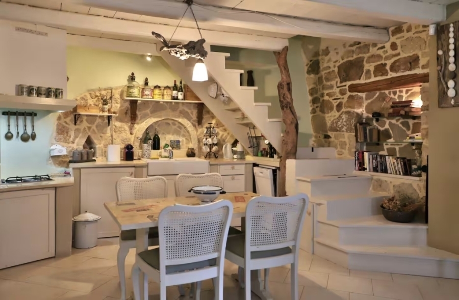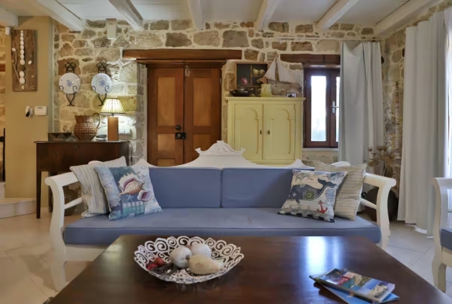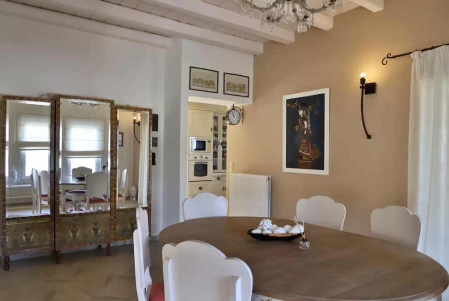 Beautiful villa of 357m2 is available for sale in an authentic Cretan village near to Sitia. It is located 5 km from the sea, Sitia and its airport. The villa, which strongly maintains its traditional style with stone elements and wooden floors and ceilings, consists of 3 levels.The villa opens into a vestibule that leads to a spacious living room with fireplace, a dining room, a separate very beautiful and fully equipped kitchen, a WC, a room that used as a work space and two bedrooms with en-suite bathrooms. On the upper level there is a room - office, a WC and the master bedroom with en-suite bathroom and dressing room. On the lower level there are two rooms as storage and laundry space, and another bedroom with en-suite bathroom. One of the features of the house is the two bedrooms that have been specially designed for families with young children. In the basement there are storage rooms and a laundry room. It provides Wi-Fi, central heating, air conditioning and solar. Outside, the villa is surrounded by courtyards at the front and back with a garden with trees, various types of plants and a well. It also includes a renovated private swimming pool and children's pool, as well as a barbecue. There is private parking and a private entrance. The verandas and balconies offer beautiful views of the surrounding area. On the same plot there is another charming traditional house of 89m2 which is developed on two levels, perfectly combining rustic charm with modern comforts. The ground floor has a comfortable living room with access to a spacious terrace, a dining room with fireplace, a fully equipped kitchen and a WC. On the upper floor there is a bedroom with an en-suite bathroom and a WC. The house offers solar, air conditioning and WI-FI. From the spacious balcony there is a magnificent view of the surrounding landscape. It is undoubtedly a remarkable investment choice combining natural beauty, traditional elements and luxury.