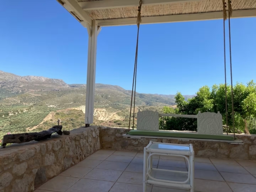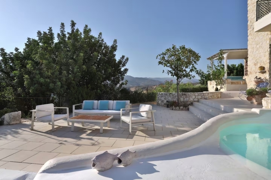 Beautiful villa of 357m2 is available for sale in an authentic Cretan village near to Sitia. It is located 5 km from the sea, Sitia and its airport. The villa, which strongly maintains its traditional style with stone elements and wooden floors and ceilings, consists of 3 levels.The villa opens into a vestibule that leads to a spacious living room with fireplace, a dining room, a separate very beautiful and fully equipped kitchen, a WC, a room that used as a work space and two bedrooms with en-suite bathrooms. On the upper level there is a room - office, a WC and the master bedroom with en-suite bathroom and dressing room. On the lower level there are two rooms as storage and laundry space, and another bedroom with en-suite bathroom. One of the features of the house is the two bedrooms that have been specially designed for families with young children. In the basement there are storage rooms and a laundry room. It provides Wi-Fi, central heating, air conditioning and solar. Outside, the villa is surrounded by courtyards at the front and back with a garden with trees, various types of plants and a well. It also includes a renovated private swimming pool and children's pool, as well as a barbecue. There is private parking and a private entrance. The verandas and balconies offer beautiful views of the surrounding area, making it a remarkable investment choice combining natural beauty, traditional elements and luxury. This is an idyllic villa that offers everything you need.