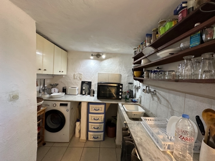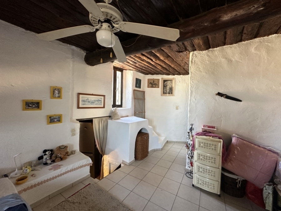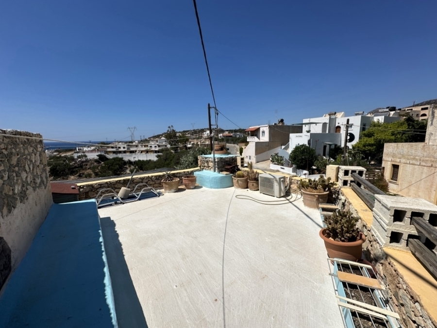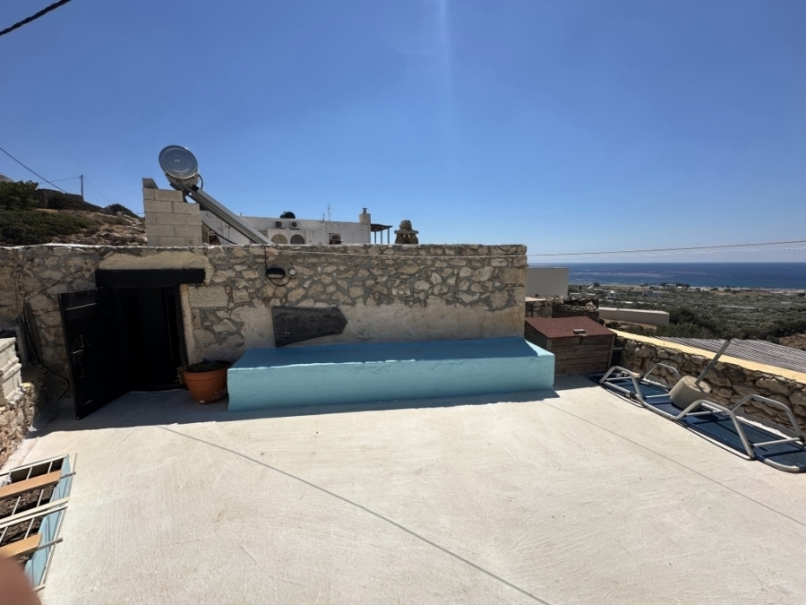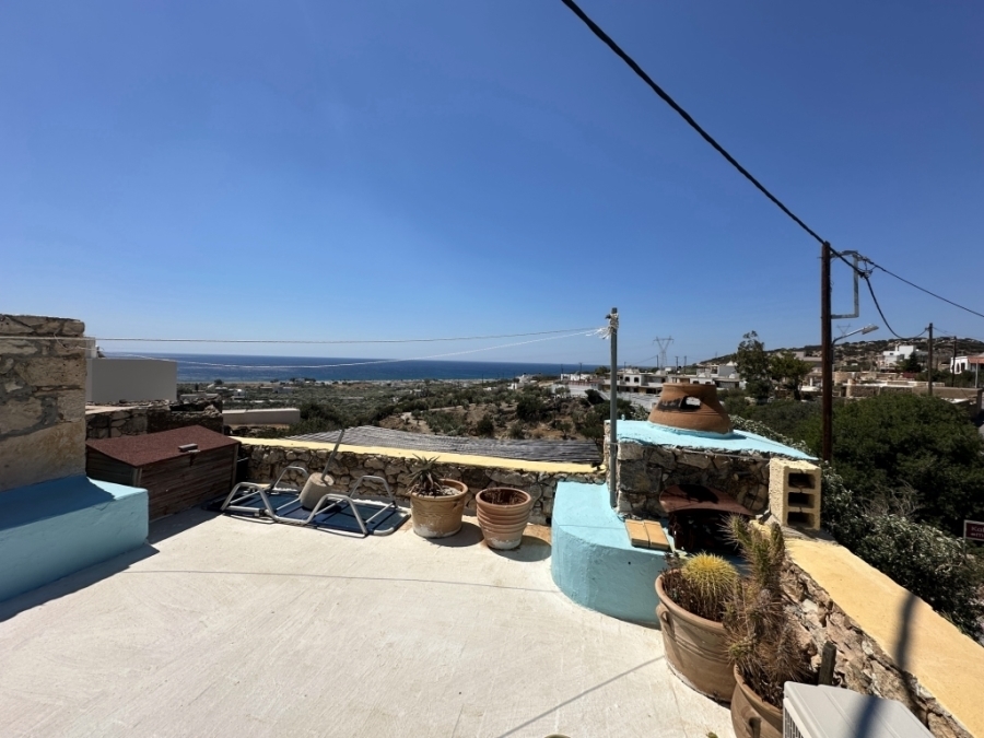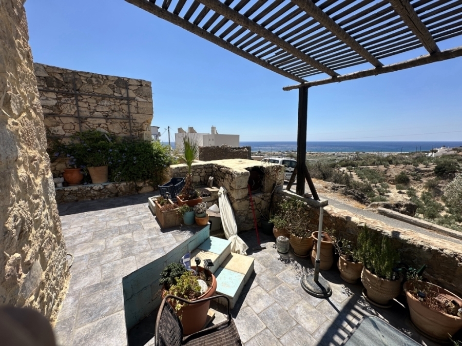 Old stone-built house of 90m2 within a plot of 110m2 is available for sale in the Koutsounari area of Ierapetra. It is just 1km from the sea, 10km from the city of Ierapetra and 40km from the International Airport of Sitia. Renovated in 2007, it is developed on three levels. The house opens onto the ground floor which has the living room. Three steps down lead us to the kitchen, the bedroom and the bathroom with a corner bathtub. Going up three steps above the living room there is also a bedroom with a picturesque form of a fireplace and the bathroom with a shower. From this level it leads us to the veranda with a wonderful view of the Cretan Sea. It has a wooden ceiling with fans, air conditioning in the living room and solar. Outside it has a courtyard with a wooden pergola. It is a good investment choice in a quiet area as a permanent or holiday residence.