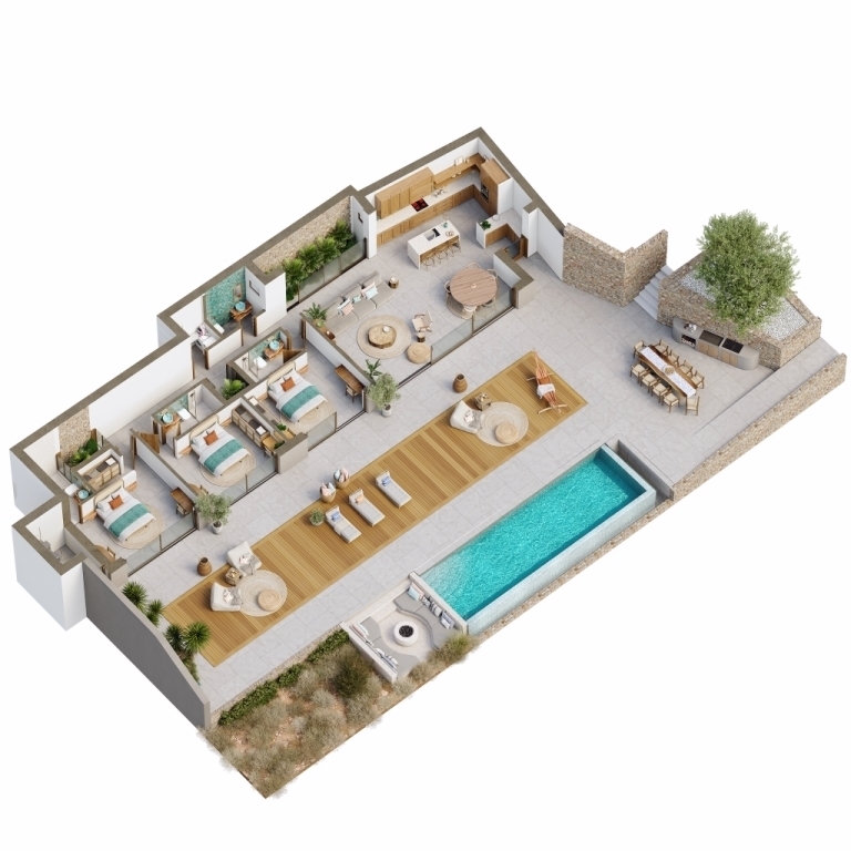 Under construction villa of 180.6m2 is available for sale in a stunning location in Pines Elounda, Lassithi. It is located within a complex of two independent villas which are developed within a plot of 4.030m2. It is 5 km from Elounda and the sea and 78 km from the International Airport of Heraklion . The configuration of this cave villa is as follows: It has an open area living - dining room and kitchen, a WC and a laundry room. In addition, it has three bedrooms all with en-suite bathrooms and one of them provides a private dressing room. The villa is air-conditioned and provides central heating. Outside there is a terrace with an outdoor dining area, a living room with an outdoor fireplace, an infinity pool and a parking space. Offering panoramic views of the Elounda Bay, it is a wonderful permanent or holiday villa that would make anyone proud of their choice.