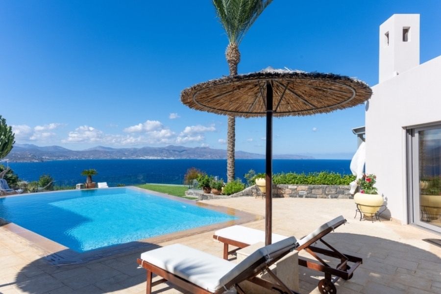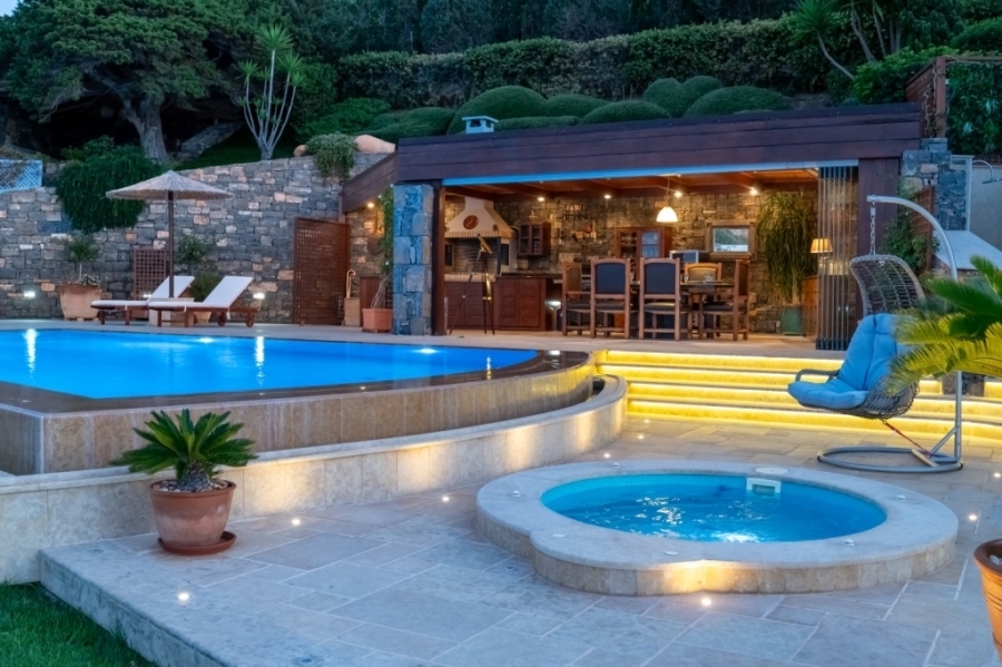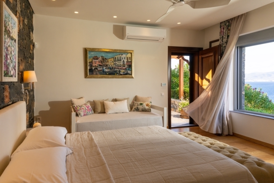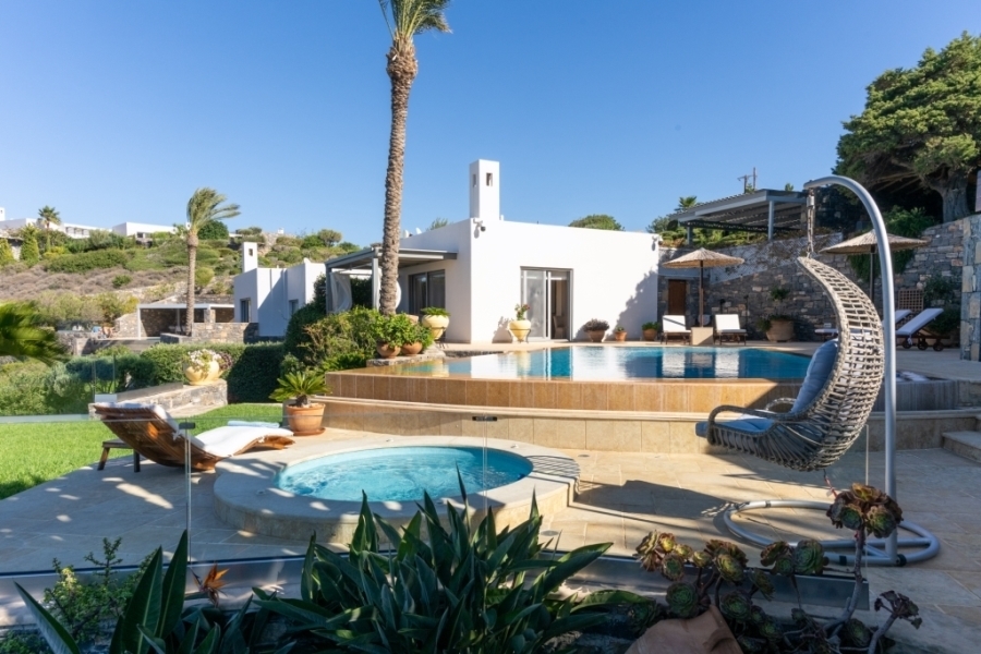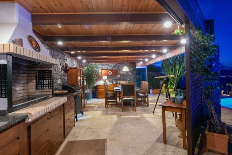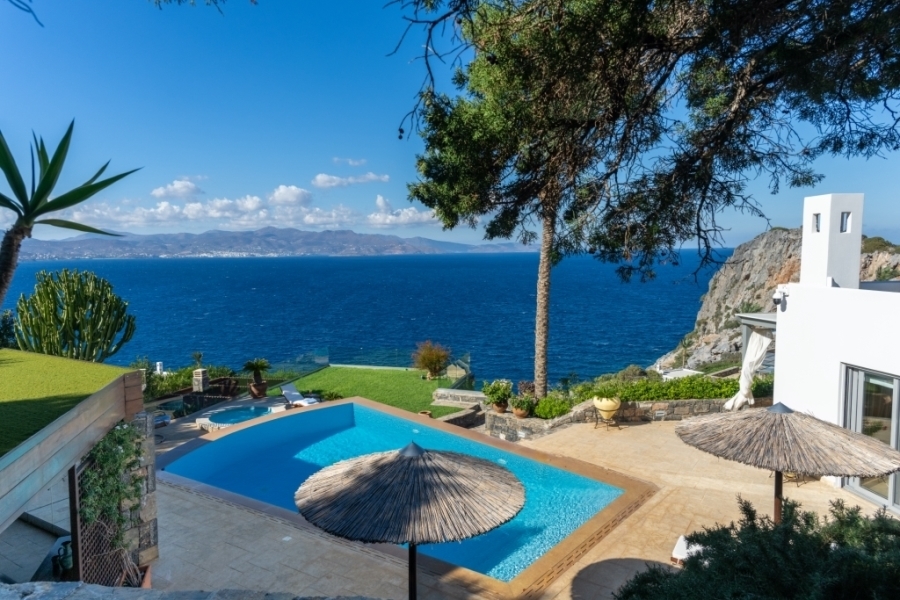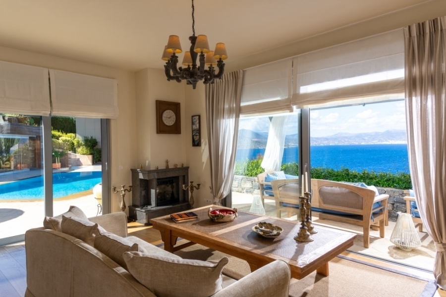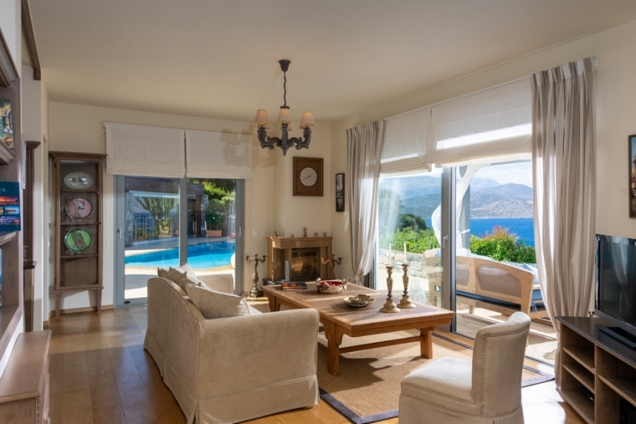 Luxurious furnished villa of 190m2 with guest house for sale, offering panoramic views of Miramvelo Bay and the surrounding area. It is located on a seaside plot of 2.500m2, 12 km away from the town of Agios Nikolaos and approximately 75 km from the international airport of Heraklion. The villa is characterized by a comfortable open area dining - living room with fireplace, a WC and a fully equipped kitchen. On the ground floor there are three bedrooms, one of which has an en-suite bathroom. There is also a bathroom for the other two bedrooms and a small gym. All rooms have wooden floors except for the bathrooms which have marble. In the basement there are auxiliary rooms such as a washing machine , dryer, storage room as well as all mechanical installations which are independent. It is noteworthy that the villa has its own water supply system for drinking and irrigation water. Outside there is a large terrace that leads to a private swimming pool and an outdoor circular jacuzzi with unobstructed sea views. There is also a covered parking space for 3 vehicles and a guest house of 35m2 which has an open plan area as well as a separate bathroom and dressing room. The villa is surrounded by an impressively admirable garden with cacti trees and flowers. Also it has a wonderfully enclosed area of 45 m2 with a dining area and a barbecue - oven. A unique investment opportunity combining modern lines with the sense of peace and privacy that we all seek.