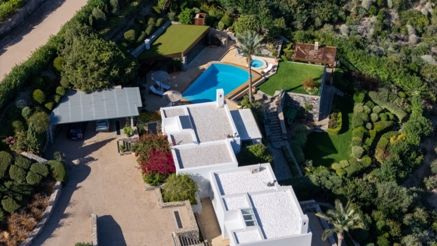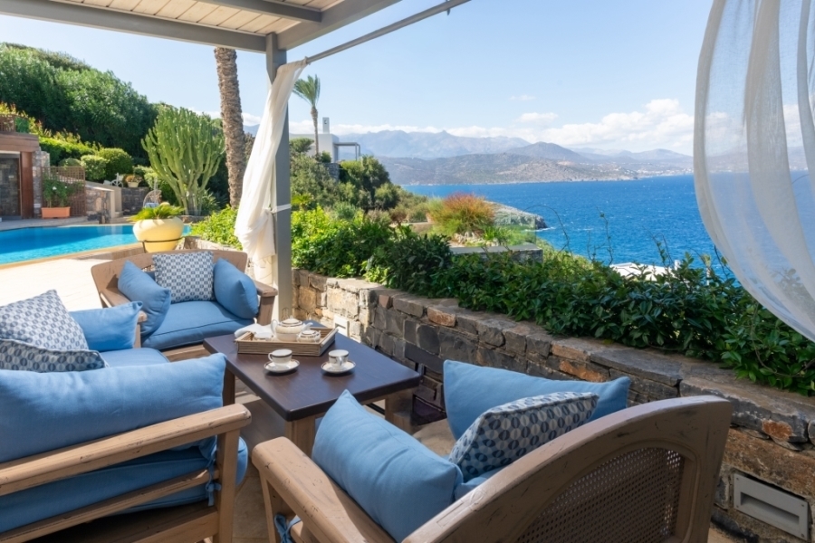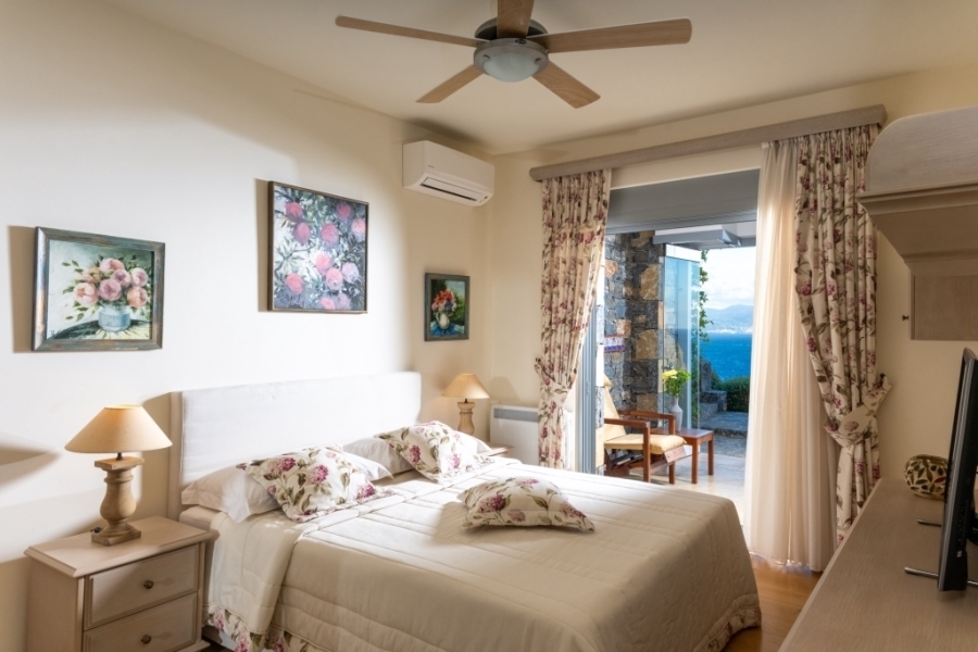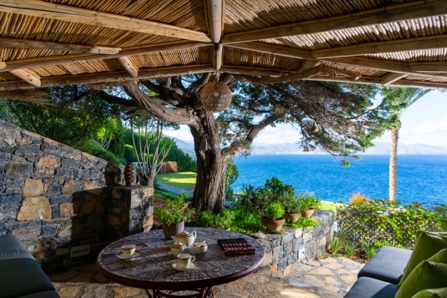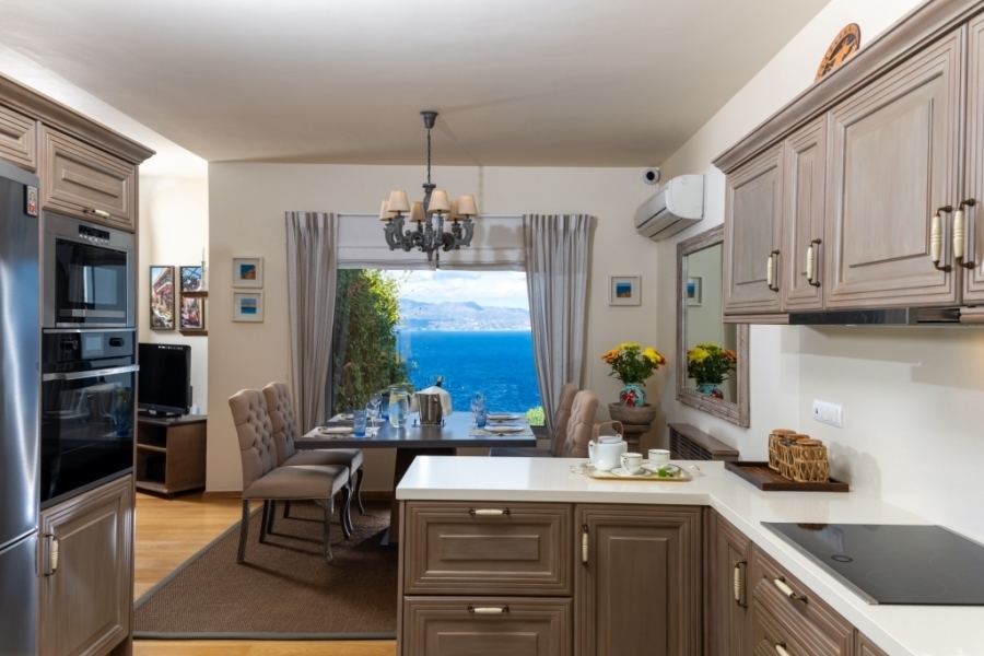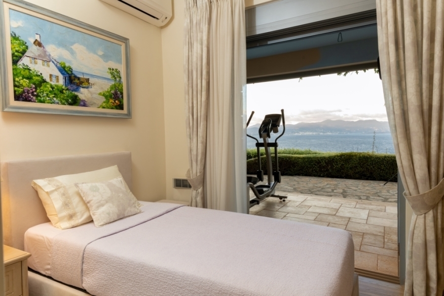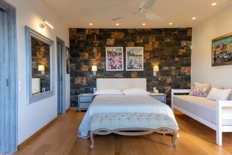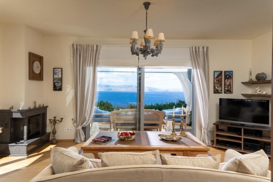 Luxurious furnished villa of 190m2 with guest house for sale, offering panoramic views of Miramvelo Bay and the surrounding area. It is located on a seaside plot of 2.500m2, 12 km away from the town of Agios Nikolaos and approximately 75 km from the international airport of Heraklion. The villa is characterized by a comfortable open area dining - living room with fireplace, a WC and a fully equipped kitchen. On the ground floor there are three bedrooms, one of which has an en-suite bathroom. There is also a bathroom for the other two bedrooms and a small gym. All rooms have wooden floors except for the bathrooms which have marble. In the basement there are auxiliary rooms such as a washing machine , dryer, storage room as well as all mechanical installations which are independent. It is noteworthy that the villa has its own water supply system for drinking and irrigation water. Outside there is a large terrace that leads to a private swimming pool and an outdoor circular jacuzzi with unobstructed sea views. There is also a covered parking space for 3 vehicles and a guest house of 35m2 which has an open plan area as well as a separate bathroom and dressing room. The villa is surrounded by an impressively admirable garden with cacti trees and flowers. Also it has a wonderfully enclosed area of 45 m2 with a dining area and a barbecue - oven. A unique investment opportunity combining modern lines with the sense of peace and privacy that we all seek.