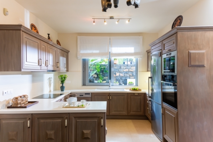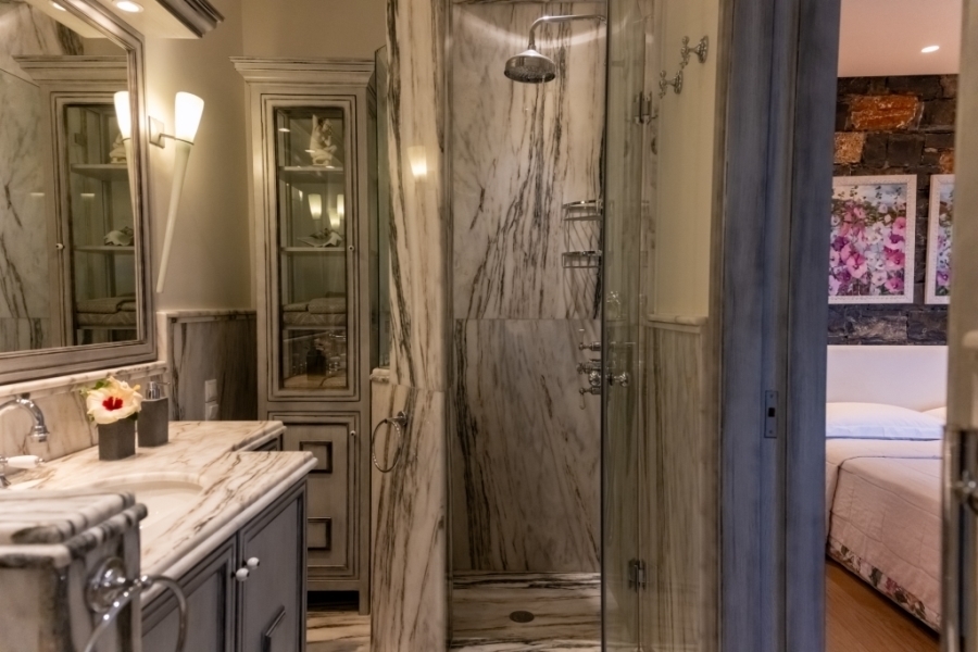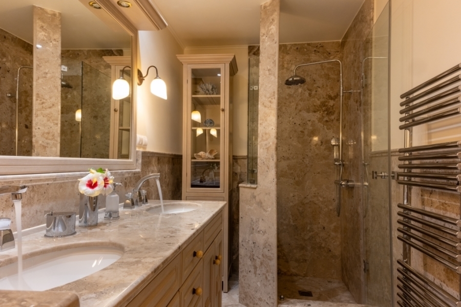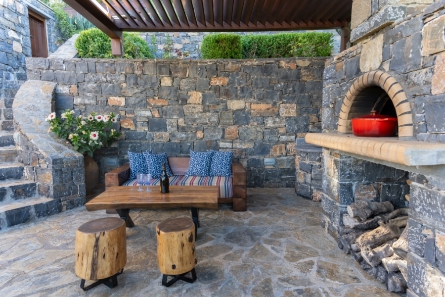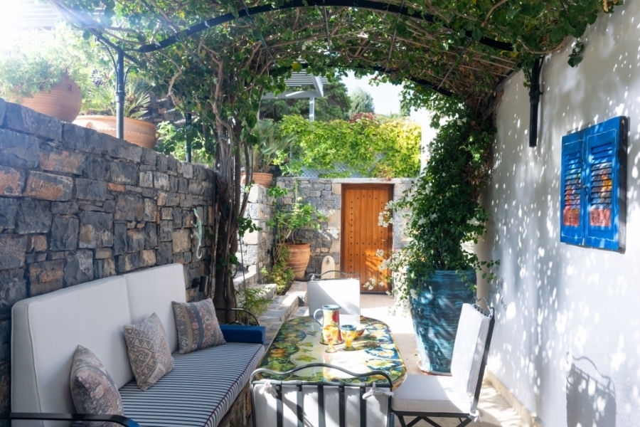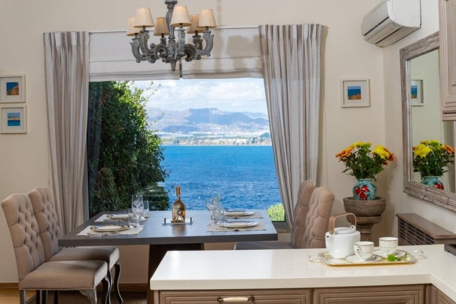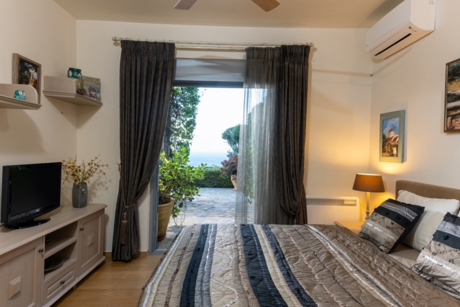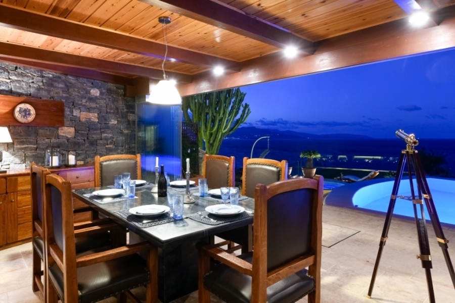 Luxurious furnished villa of 190m2 with guest house for sale, offering panoramic views of Miramvelo Bay and the surrounding area. It is located on a seaside plot of 2.500m2, 12 km away from the town of Agios Nikolaos and approximately 75 km from the international airport of Heraklion. The villa is characterized by a comfortable open area dining - living room with fireplace, a WC and a fully equipped kitchen. On the ground floor there are three bedrooms, one of which has an en-suite bathroom. There is also a bathroom for the other two bedrooms and a small gym. All rooms have wooden floors except for the bathrooms which have marble. In the basement there are auxiliary rooms such as a washing machine , dryer, storage room as well as all mechanical installations which are independent. It is noteworthy that the villa has its own water supply system for drinking and irrigation water. Outside there is a large terrace that leads to a private swimming pool and an outdoor circular jacuzzi with unobstructed sea views. There is also a covered parking space for 3 vehicles and a guest house of 35m2 which has an open plan area as well as a separate bathroom and dressing room. The villa is surrounded by an impressively admirable garden with cacti trees and flowers. Also it has a wonderfully enclosed area of 45 m2 with a dining area and a barbecue - oven. A unique investment opportunity combining modern lines with the sense of peace and privacy that we all seek.
