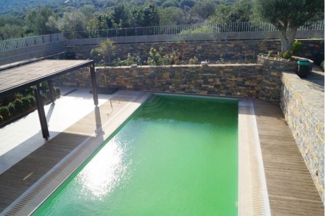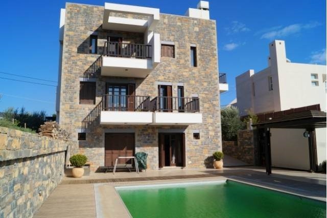 Stone detached house of 300m2 is available for sale only 1.5 km from the sea and the town of Agios Nikolaos Eastern Crete and 66,5km from the international airport of Heraklion. The house is developed on four levels in a plot of 1.100m2. It consists of two living rooms with dining rooms, two kitchens, four bedrooms and four baths. Additionally there is a laundry room. The house has air-conditioning, central heating and two fireplaces. Externally there are spacious terraces, garden with flowers, pergkola and nice barbecue area, parking and swimming pool of 40m2 with outside shower. Additional it features by alarm, boiler, solar heating, security door, satellite and video intercom. Notably that there is the possibility to divided by a common wall in two houses. The house is ideal for permanent or holiday home as it is close to the amenities of the city and also in quiet environment.