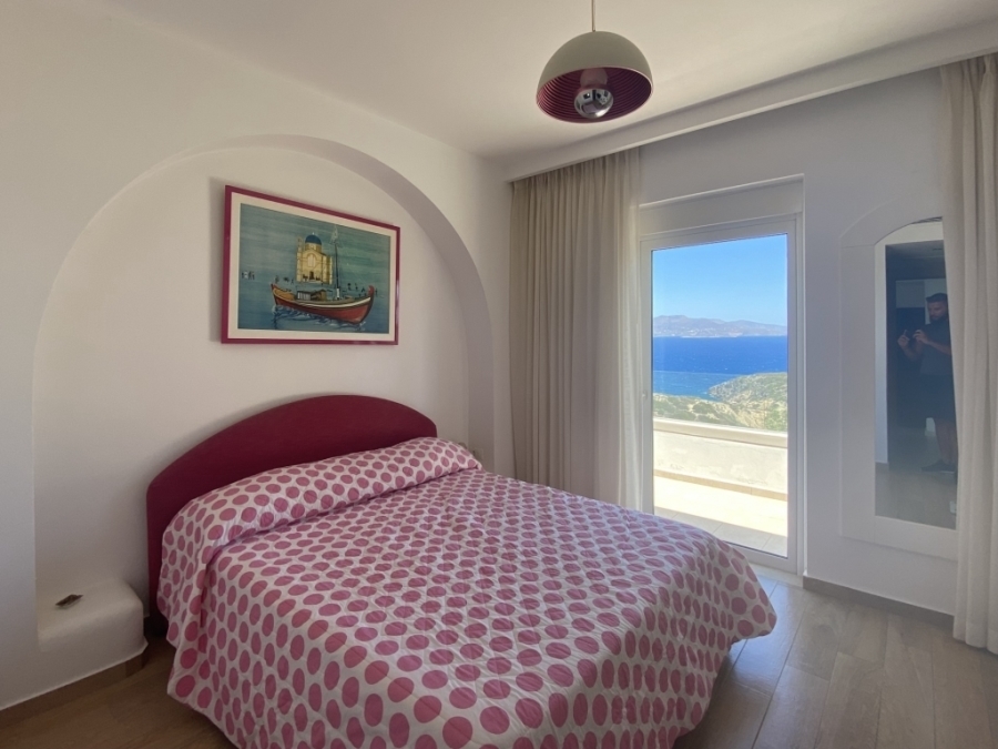 A wonderful villa of 275m2 + 70m2 garages, with the most fantastic panoramic views is available for sale. It is located only 300m from the sea, 10km from the capital of eastern Crete, Agios Nikolaos and 75km from the international airport of Heraklion. An electronic security gate and a private driveway leading to the villa and also there are two secure garages. Within a land plot of 4,010 m2 this stylish villa opens to a spacious living room with sliding glass doors and windows that offers amazing sea views. There is a kitchen fully equipped, including electric cooker with induction hob and extractor fan, double sink, fridge freezer with ice maker and washing machine. Also there is a WC for the guests and a bedroom with en-suite bathroom with Jacuzzi. This bedroom has its own veranda where there is a large round external sofa. Stone steps ascend to the master bedroom which includes an unusual free standing bath tub. There is a spacious walk in dressing room, also equipped with mini-bar fridge and safe. It has a large terrace. The two guest suites are downstairs and each bedroom has its own terrace and en-suite shower.. The 5th bedroom can be a separate studio with external access as this space has all services available there (kitchen and bathroom).Additionally there are two spacious store rooms, one of which is used for the house machinery (boiler, alarm etc.). All the furniture and white goods such as statues and sculptures and other works of art have been bought from Italy. The villa includes solar panel, boiler, central heating and air-conditioning. Outside there is a beautiful landscaped garden with grass, flowers and trees ,bbq, a dining area, a large swimming pool and night lights that makes a nice atmosphere. It is a good choice for those who are looking for a different type of villa with panoramic amazing sea views.